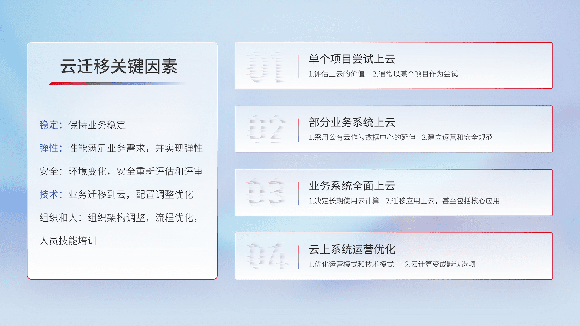 结合实际业务,,,,从规划设计、、、云平台选型、、、、云原生改造、、、、数据迁移、、、、集成交付,,,迁移全过程为客户识别最佳上云路径,,做好风险识别管理,,,设计网络架构、、、身份权限、、、安全审计合规、、、操作审计、、、日志审计、、、监控告警策略、、、多站点容灾设计等,,对云上基础设施进行整体规划,,,提升IT治理水平,,,以满足弹性、、、、高可用、、、、高性能的需求。。。