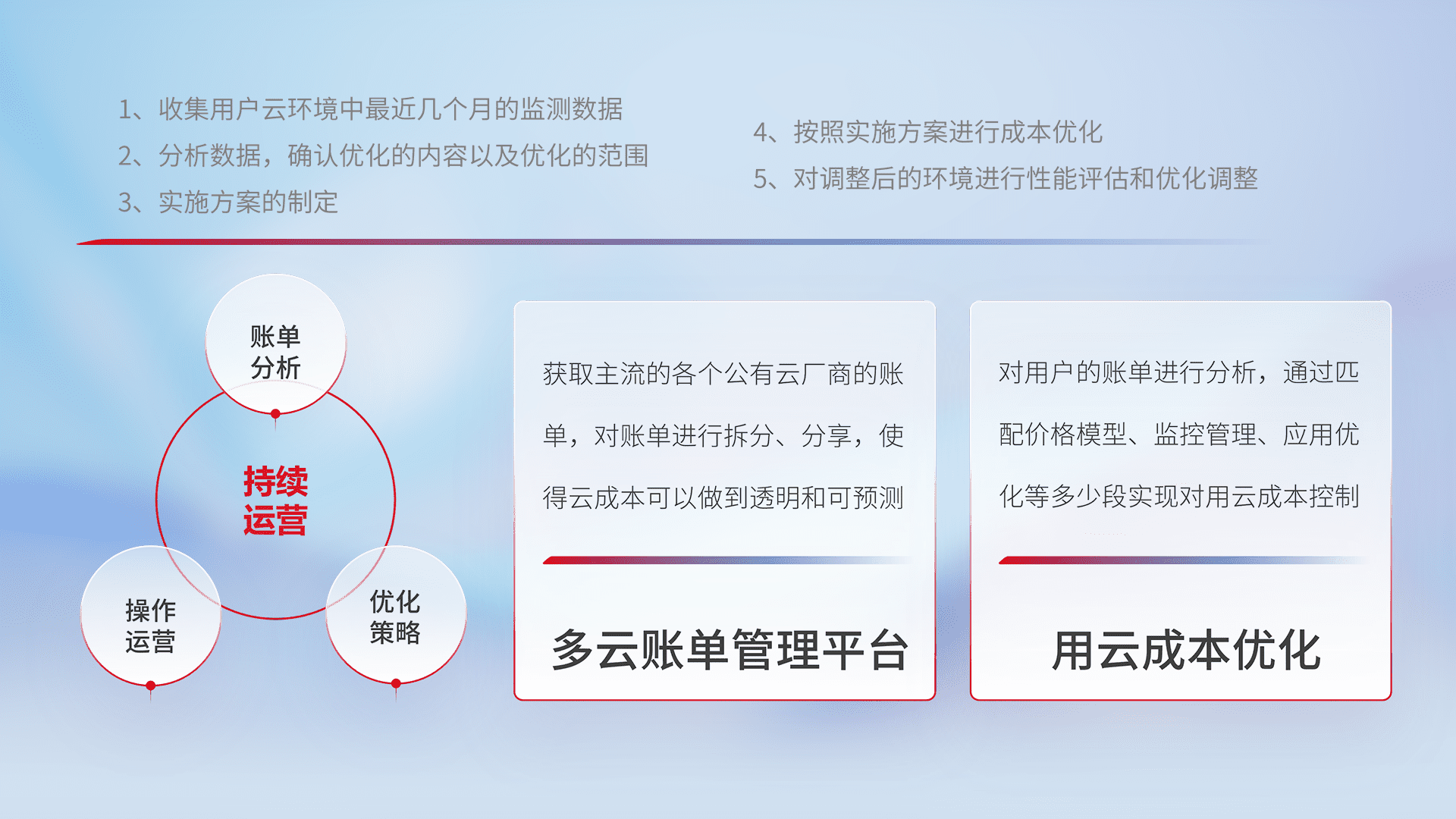 通过多云纳管,,,,以统一的资源数据模型把客户的云资源进行抽象和封装,,,,进而实现对多云资源的统一操作,,,,保障云资源管理的可靠性、、、、稳定性与可用性。。。。量身定制化运维内容,,配置、、开发运维、、补丁管理、、、、备份、、监控、、认证和访问管理、、、、审计和日常巡检等,,,保障在用云过程中的可靠度,,,稳定度以及高可用率。。